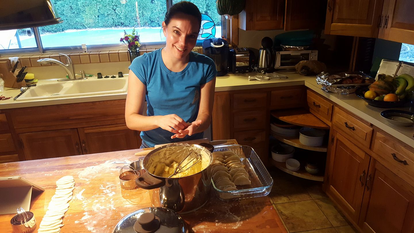 Pierogis (Ukrainian potato-fllled ravioli or pot sticker) are a Yost tradition David has brought to the Batt’s Thanksgiving table. He suggests making the potato filling first and then having your spouse do the rest of the prep.